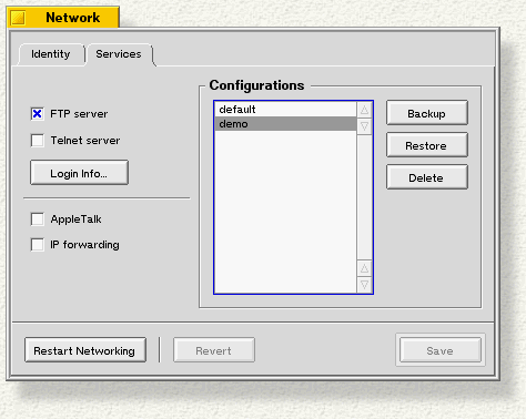 To configure your computer to accept FTP and Telnet connections, to tell it look for an AppleTalk network, or to enable IP forwarding, go to the Services tab: