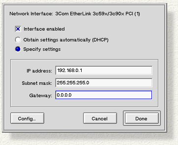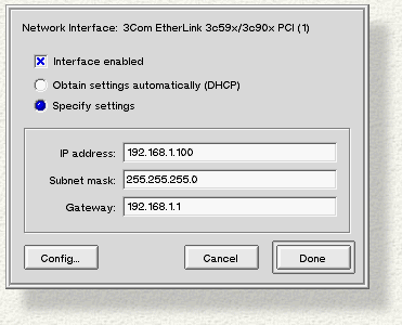 When you're finished configuring the card, click Done (or Add if you're configuring a jumpered card), or Cancel to abort. The Network panel should now display your card's address, and should list the card as "Ready" (or "Disabled" if you unchecked Interface Enabled).