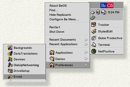You set up your e-mail environment in the E-mail preferences. To launch E-mail, click on the Be logo, open the Preferences item, and click on E-mail :