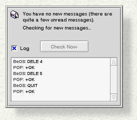 The Mail Status window shows how many new and unread messages you have, lets you check for new incoming messages, and displays the status of mail as it's sent and received. If you check Log the window expands to show you the details of mail access.