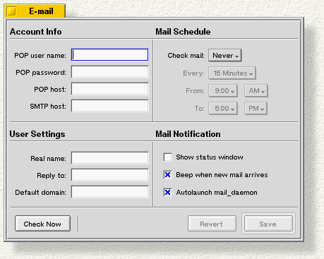 The information you enter in this window tells the BeOS where to find your mail server on the network, your name and password, and other mail-related options. Most of this information comes from your ISP, or your network administrator.
