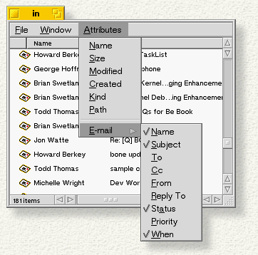 Any Tracker folder window that contains an e-mail message is automatically given extra e-mail attributes that you can see when you put the window in List View mode.