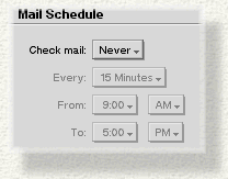 These menus let you set how often the system should check for incoming mail, and send new outgoing messages. During the check, new incoming messages are downloaded from the POP host to your computer, and outgoing messages are uploaded from your computer to the SMTP host.
