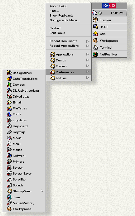 Preference applications can be accessed by selecting the Preferences folder from the open the Be Menu, as shown here.