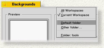 The two Workspaces commands apply the settings to all workspaces or to the current workspace. Default folder applies the settings to all Tracker folders; Other folder... lets you choose a specific folder. or to a specific folder (Other). When you add a background to a specific folder, the name of the folder is added to the Folder: list (at the bottom of the menu) so you can retrieve the settings later.