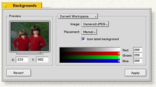 For a background image, drop the image file into the Preview box, and choose a placement option from the Placement: popup (the Center and Scale to Fit placements apply only to desktop backgrounds, not to folders). If you choose the Manual setting, the X: and Y: fields will display the coordinates of the image's origin (upper-left corner). To move the image, simply drag it into the Preview screen, or type in the X: and Y: fields.
