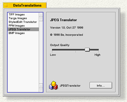 The DataTranslations window shows you which translators you have on your system, and, if they have settings (not all do), lets you adjust them. For example, the JPEG translator lets you adjust the output quality of the image.