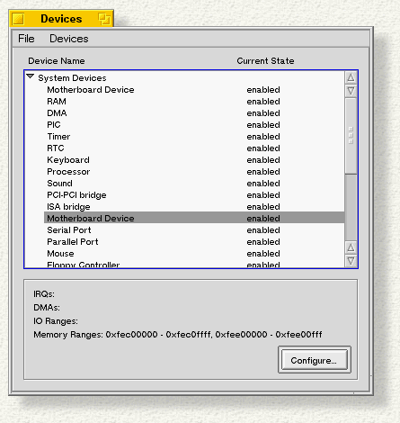 In addition to using the Devices scrolling window to see what devices you have, you can highlight a device, click Configure, and go to the Info tab of the panel that opens for basic information about the device. This includes whether or not it's enabled, the type of device it is, which bus it's on (ISA or PCI), whether or not a resources conflict exists, and so on.