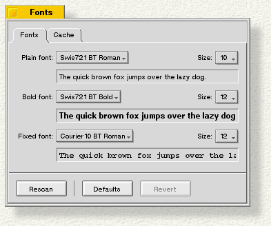 Fonts lets you set the system fonts and the size of the font caches. There are three types of system fonts: plain, bold, and fixed-spaced. Individual fonts have additional popups that let you choose among style options available for that font. You can set the size, from 9 to 12 points, with the Size: popup.