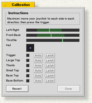 After your joystick is identified, click Calibrate to display the window where you fine tune your joystick. Text at the top of the panel instructs you in the art of calibrating your joystick (the window's appearance depends on the type of joystick you have).