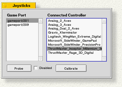 The Game Port list shows the available ports on your computer, with the port your joystick is plugged into selected. Probe automatically tries to figure out what kind of controller you have when you select a game port. If Probe can't identify your controller, you can select it manually from the Connected Controller list.