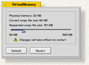 The VirtualMemory window displays the amount of installed RAM (Physical Memory:) and the amount of hard drive space allocated to virtual memory (Current Swap File Size:). You can't change the physical memory (at least not from software), but you can change the virtual memory size--simply drag the slider around (or Tab to highlight the slider and use the arrow keys to adjust it in 1 MB increments). You have to reboot to make your change take effect.