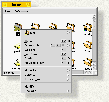 Many items that appear on the desktop and in Be applications have context menus associated with them. A context menu is an object-specific menu that's displayed when you Control+click on the object, or when you press (mouse-and-hold) the object with the second mouse button. (The context menu will also open if you press with the first mouse button, but there's a small delay while the system waits to see if you're going to double-click the object.)