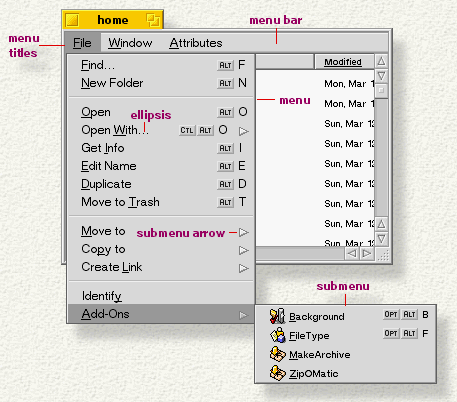 Almost all windows have a menu bar, a grey bar at the top of the window that contains some number of menu titles. Click on a title and the menu it corresponds to pops open, displaying its commands. An arrow to the right of a command indicates a submenu; click on the command and the submenu will pop open. If a command title has an ellipsis ("...") at the end, it indicates that if you choose the command, another window will appear that asks you to supply more information.
