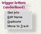 is a single character that's assigned to a command. By pressing a trigger letter, you invoke the associated command. Trigger letters are underlined in a menu's title or in a menu item, and only work when the menu is open.
