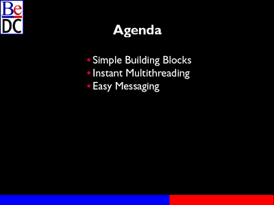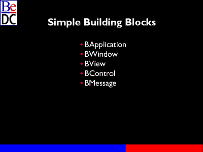 Okay. The BeOS provides you with a framework, simple building blocks that you use to put together applications, objects like application object, window object, menu object, messages. They all fit together to allow you to build applications that let you -- they give you instant multithreading.