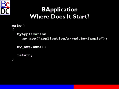 So where does an application start? You've all probably -- well, hopefully, programmed C and C++ before, know every application starts in a main function. Well, here's your typical main for a BApplication. Here we're creating an instance of it's actually a class derived from BApplication, just called MyApplication.