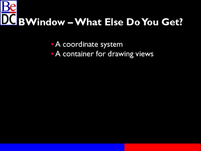 So what else do you get in a window? Well, you get a coordinate system and a container for drawing views. Now, when you create a window in the BeOS you don't actually draw in that window; you draw in a view that you place in that window. And the coordinate system in a window is based 00 from the top left corner of that window. So you don't have to do a calculation to where you want it to be on the screen, you just go straight to that window and add views to the window to draw different objects inside that window.