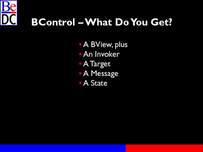 So let's take a look at what BControl is and how you deal with that. What do you get when you create a control? Well, you get a BView, plus an Invoker. An Invoker is an object that sends a particular message when it gets invoked. In the case of a button, when you click on the button it's going to send a message someplace; right?