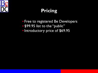 The pricing. First of all, BeOS Release 3 is free to registered developers. That has always been the goal and continues to be the goal. Why would we want you to be our customers, when you're our partners? Then that's where it will be. And so the release continues to be free to developers.