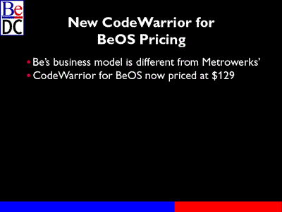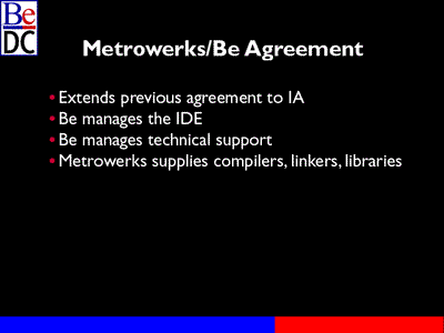 That also means that we'll manage technical support. That means the developers have one place to call to get ahold of tech support people. If you have a question about development tools, the IDE, the compilers, or the BeOS itself, you don't have to bounce around between two support organizations, Metrowerks and Be. We'll be taking on that support responsibility effective today.