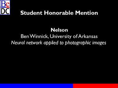 So without any more delay I'm going to go ahead and get started with the student category. In that category we have two honorable mentions and one Masters winner. I will start with the honorable mentions. What I will do as I announce these, let me tell you what you win.