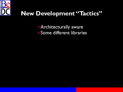 Remember also that at the portability issues, the fact that the code is very portable between platforms with BeOS works in both people's favors in both ways. It certainly makes those key PowerPC developers who want to see a bigger market in Intel space allow them to move forward. But it also allows code to play back the other way. And we ourselves rely on that. So we have a common code base for both platforms and we are trying to keep it that way absolutely as long as possible. And keep adding these features to the code base so they turn up on both machines. Easy stuff like slides and tab views, direct windows, is a more significant feature that is owned by platforms.