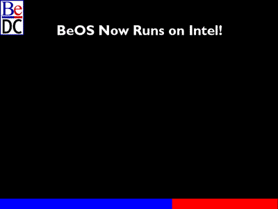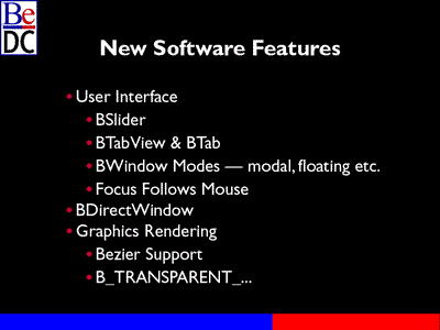 Having had all these questions now about DirectWindow, that probably leads us to my next bullet point, probably one of the most significant, and I think perhaps strewn upon you as developers, everybody all knew about Intel, they all knew the Intel architecture was going to be available for this release. I don't think anybody really expected BDirectWindow, I don't think everybody expected some of the features they saw in yesterday morning's demonstration and Pierre Raynaud-Richard's demonstration yesterday afternoon. Perhaps it's one of the delights of being at Be, we can spring those things on you every so often and one of the more significant features about 3 is not the support for Intel, but the support for DirectWindow.