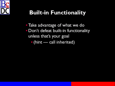 First of all, what should you do with the built-in functionality. And first thing I want to do is mention that try to take advantage of what we do. We at Be have spent time making the objects in our system, the view widgets, controls, buttons, sliders, things like that. We've taken time to make them scriptable, so that's a good thing to use in your own applications, to take advantage of in your own applications. And the key there is to not defeat that built-in functionality when you're writing your own application.