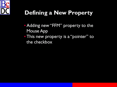 And then the other way is just defining entirely new concepts or entirely new properties in your own application and I'm going to -- this slide's a little misleading. I really consider this an example of extending property, extending a built-in property. And what I'm going to do to the mouse application that we just demonstrated is I'm going to define a new property called FFM and I'm going to define that property at the top level of the application.