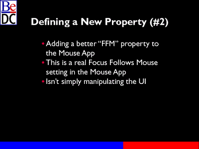 Okay. So now I'm going to get to defining a completely new property and again, I'm going to call that property FFM and I'm going to say that this is actually the more appropriate way to do it in most cases, and what I'm going to do is say that the mouse application has this concept of Focus Follows Mouse being on or off and -- and in terms of scriptibility I don't really want to simulate manipulating the user interface, I don't want to simulate clicking a CheckBox. I just want to turn on a state or turn off a state, true or false.