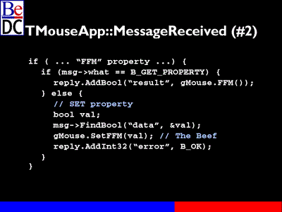 So that same mouse app object overrides MessageReceived and to simplify things so it could fit on one slide I plan to remove stuff from the top here and there's logic -- if this code handles multiple messages, and a real application probably would, you'd need some logic to determine, yes, this message is the FFM message and there's helper routines in the BeOS in order to help you figure that out.
