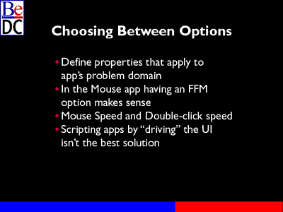 And that's kind of the process I went through with the mouse app, where manipulating the CheckBox might be nice because the app developer didn't have to think about it, but actually defining an FFM state, Focus Follows Mouse state seemed more appropriate. And in the same token, in looking at the mouse application, having a mouse setting speed and a double-click speed just adds numeric values that you can get and set to the mouse application, would be the right way to implement scripting in the mouse application, not by manipulating the particular sliders in the application.