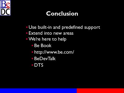 So we'll look at some code and I'll give you some examples of how you would work with existing functionality that's built into the BeOS, and there is quite a bit of built-in functionality that you get just by using our kits, and how you could extend that functionality as appropriate in your own applications.