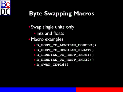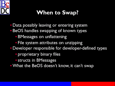 The BeOS handles swapping of its own defined times. For example, when you take a BMessage and you flatten it either into a file or put it across the Net, the BeOS handles on unflattening all of the byte swapping for the known types in that message. You don't have to worry about it. We take care of it. File system attributes are swapped upon zipping. You move it across one platform to another, do the unzip, it will take care of the attribute swapping. You don't have to worry about it.