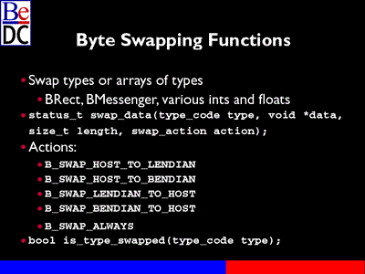 We also provide byte swapping functions for arrays of data or types. So, for example, if you've BRect, BRect has a bunch of different data in there. You can pass it to one of our functions called swap_data() that will go ahead and do the swapping for you. If you have an array of int64's, you can pass it and it will swap each one individually. That function is -- that is called swap_data where you pass the type_code, the type of data you're working with, you pass a pointer to that data. You basically pass it a size for how images that data is, if it was an int64, you would pass sizeof(int64). Also what type of action you want to swap. Again, the same thing we talked about earlier.