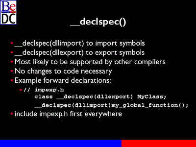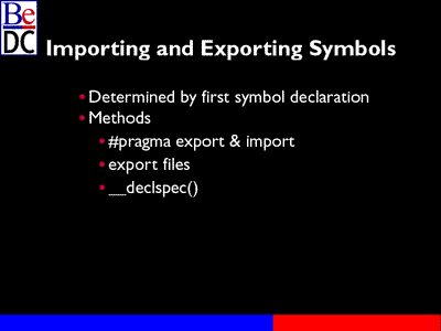 One thing about all of these importing and exporting, these are all compiler-dependent. The C and C++ specs don't say anything about how to import and export symbols. So to a certain extent all of this is going to be compiler-dependent and all #pragmas are compiler-dependent. You can't count on, if someone were to come out with an Intel or PowerPC compiler for BeOS, you wouldn't be able to count on #pragmas necessarily working. Don't necessarily count on any of these working.