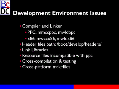 I'll move on to development environment issues. It has changed a little bit. I've got another error on this thing, under compilers and linkers. On the PPC side and PR2 we were using them as mwldc and mwld. For R3 they've added an identifier for the platform. You have compilers and lnkers mmccppc and mwldppc for PowerPC, and compilers and linkers mwccx86 and mwldx86 for x86. The header file path is the same: /boot/develop/headers.
