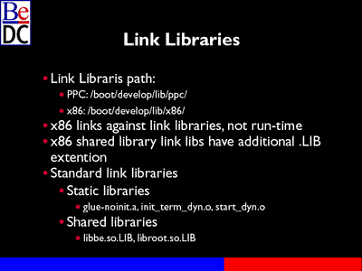 The standard link libraries have also changed. On the PowerPC side you would be used to linking against libdll.a. That's been broken up into three different parts. Both PowerPC and Intel, glue-noinit.a, init_term_dyn.o and start_dyn.o. These handle the dynamic linking code needed for your applciation. libbe.so has all the standard classes and libroot.so takes care of library management and the like.