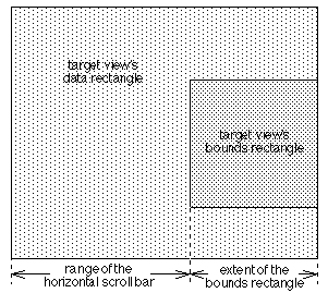 The range must be large enough to bring all the coordinate values where the target view can draw into its bounds rectangle. If everything the target view can draw is conceived as being enclosed in a "data rectangle," the range of a horizontal scroll bar must extend from a minimum that makes the left side of the target's bounds rectangle coincide with the left side of its data rectangle, to a maximum that puts the right side of the bounds rectangle at the right side of the data rectangle. This is illustrated in part below: