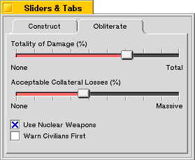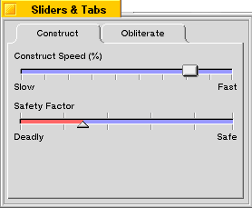In the figure below, we see a window that contains a BTabView with two BTab objects attached, called "Construct" and "Obliterate." The "Construct" tab is currently selected, and its target view is visible. The target view for the "Construct" tab contains two BSlider objects (these sliders are used as an example in the BSlider section and you can learn more about them there).