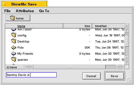 BFilePanel knows how to create and display an "Open File" or "Save File" panel, and provides the means for filtering and responding to the user's actions on the panel. The Save Panel looks like this:
